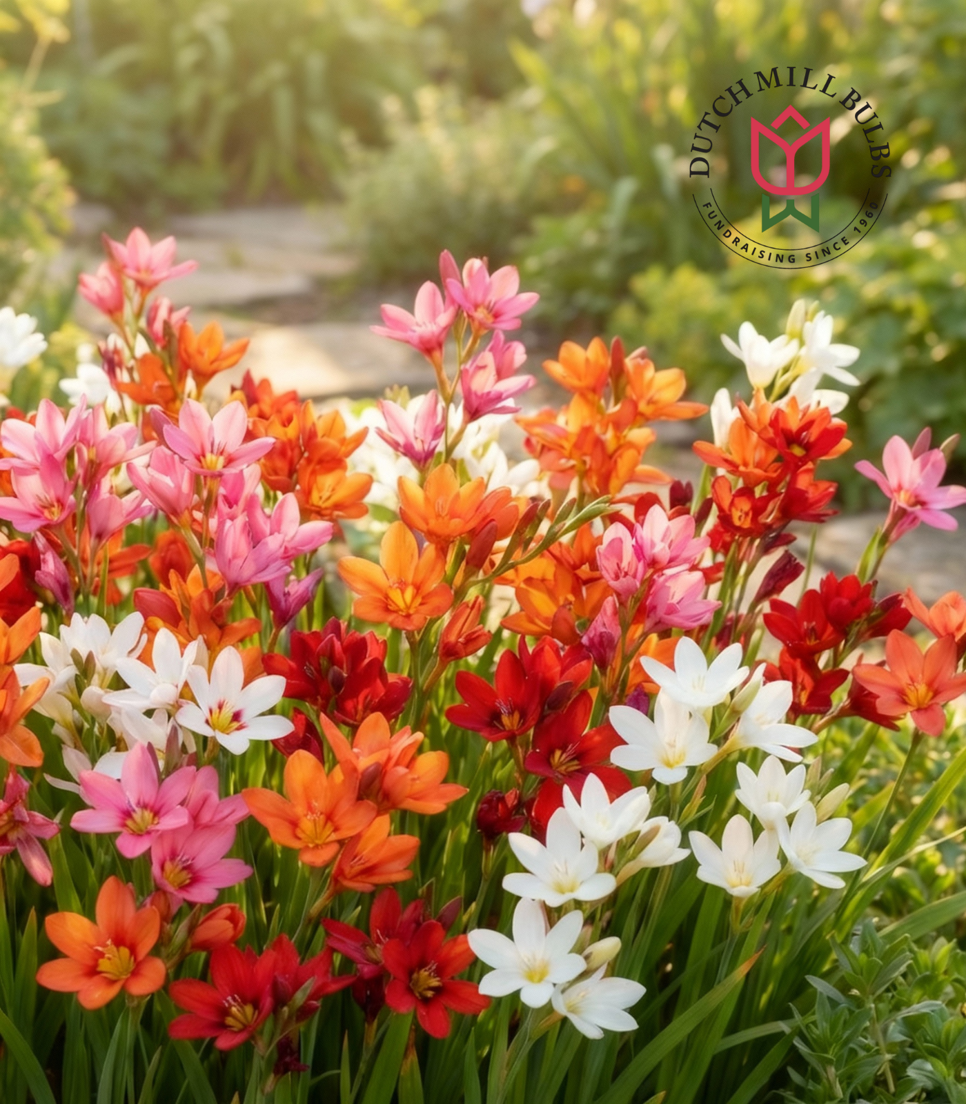 Harlequin Flower (Sparaxis tricolor) is a striking spring-planted corm known for its vibrant star-shaped blooms in bold mixed colors including red, orange, yellow, and white, each featuring dramatic dark centers that create stunning contrast. In late spring to summer, these show-stopping flowers rise on sturdy stems above sword-like foliage.